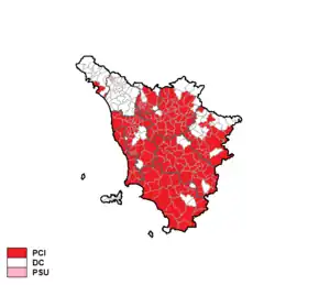The Italian Communist Party was by far the largest party. After the election, the Communists formed a left-wing coalition government with the Italian Socialist Party and the Italian Socialist Party of Proletarian Unity. Lelio Lagorio, a Socialist, was elected President of the Region.[1]