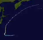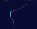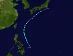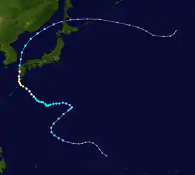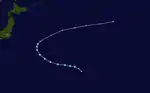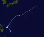 During January 8, the JMA started to monitor a tropical depression that had developed, about 500 km (310 mi) to the east of Ngerulmud, Palau.[3] Over the next day the system gradually developed further as it moved north-westwards, before it was classified as a tropical storm and named Sarah by the JTWC, after a US Navy plane had found an organised system.[3][4] The system subsequently recurved north-eastwards, before it was classified as a Severe Tropical Storm by the JMA during January 10.[5] During that day, the JTWC reported that the system had peaked, with 1-minute sustained wind-speeds of 95 km/h (60 mph).[4] Over the next day, the system quickly weakened and became an extratropical cyclone during January 11.[4] Sarah's extratropical remnants were subsequently tracked as they moved north-eastwards, until it made landfall on Canada and broke up over the mountains of British Columbia during January 17.[4]
