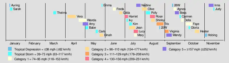| Note: Data begins at the year 1955 due to earlier data being increasingly unreliable. Totals for tropical storms and typhoons after 1964 are from the Japan Meteorological Agency, and totals for the unofficial super typhoon category are from the Joint Typhoon Warning Center. | |||