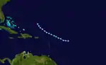 This tropical depression formed 900 miles (1,400 km) west of the Cape Verde Islands on September 16,[27] and moved west-northwest across the tropical Atlantic Ocean.[28] The system moved within 750 miles (1,210 km) east of the Leeward Islands before dissipating on September 20.[29]