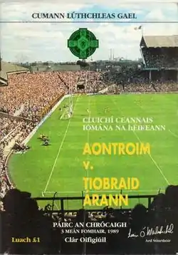 The 1989 All-Ireland Senior Hurling Championship Final was the 102nd All-Ireland Final and the culmination of the 1989 All-Ireland Senior Hurling Championship, an inter-county hurling tournament for the top teams in Ireland. The match was held at Croke Park, Dublin, on 3 September 1989, between Tipperary, managed by Bab's Keating and Antrim, managed by Jim Nelson. The game was shown live in Ireland on Network 2 with match commentary provided by Ger Canning and comments throughout provided by Jimmy Magee. The Ulster champions lost to their Munster opponents on a score line of 4-24 to 3-9.[1]