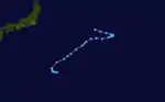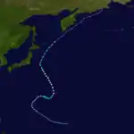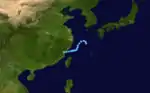 Developing as a disturbance in the Philippine Sea on June 18, the system moved westward initially and became a tropical depression late on June 20 and weakened on June 21. Early on June 23, the large system with gales well removed from its center became a tropical depression once more. A trough to its northwest had deepened, which was accelerating the cyclone northward. It became a minimal tropical storm during this acceleration. Late that day, it became a frontal wave before moving through Japan into the Sea of Japan.[23]