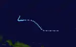 On January 15, Tropical Storm Winona crossed the International Date Line and entered the Western Pacific basin. Embedded within broad easterly flow, the storm turned west-southwestward, a heading it would retain until dissipation, and accelerated. This acceleration caused slight strengthening of the storm by enhancing winds on the north side of the low.[5]