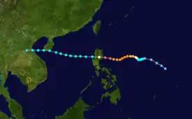 Originating from a tropical disturbance near Palau on June 4, Dot tracked west-northwestward towards the Philippines. Crossing the country on June 6, the system moved over the South China Sea and attained typhoon status. Late on June 8, Dot reached its peak intensity with winds estimated at 185 km/h (115 mph). The system weakened slightly the next day before making landfall in Hainan Island. A weakened storm then entered the Gulf of Tonkin before striking northern Vietnam and dissipating on June 12.[20]