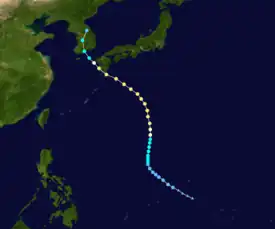 Originating from a monsoon trough on July 21, Judy began as a tropical depression west of the Northern Mariana Islands. Tracking west-northwest, the system gradually intensified into Tropical Storm Judy on July 23. By this time, the storm had turned due north. Two days later, Judy attained typhoon status as it began a gradual turn to the west-northwest. Late on July 25, the storm peaked with winds of 165 km/h (105 mph). Striking Kyushu on July 27, interaction with the island's mountainous terrain caused Judy to quickly weaken as it neared South Korea. The weakened storm struck the country west of Pusan the following day before losing its identity near the border with North Korea. The remnants of Judy were last noted over the Sea of Japan.[40]