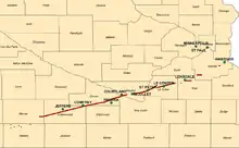 The thunderstorms that would eventually spawn the tornadoes began forming in southeastern South Dakota around 2:00 pm. The first severe weather report of the outbreak was of 3⁄4 inch (19 mm) diameter hail 2 miles (3 km) south of Brandon, South Dakota.[5] Shortly thereafter the thunderstorms moved east across the border into Minnesota. After several more reports of severe hail with the growing thunderstorms,[6][7] the first tornado of the day—rated F2 on the Fujita scale—touched down at 3:23 pm 2 miles (3 km) north of Lismore.[8] It was on the ground for less than 1 mile (2 km) and caused minor damage. Five more tornadoes (all rated F2 or lower) briefly touched down during the next hour in the same general area; none of which inflicted major damage. All of these tornadoes were spawned by the same supercell thunderstorm. During the remainder of the afternoon hours, this supercell would proceed to track east-northeast across southern Minnesota for 150 miles (240 km), tracking slightly north of the warm front.[9]