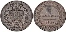 In addition to the Kingdom of Sardinia, the Duchy of Parma and Piacenza also retained the Napoleonic decimal system, and in 1830, during the reign of Marie Louise of Austria, 2029360 1-cent coins were minted with the same characteristics as those of the Kingdom of Sardinia.[15] This coin was also minted in 1854 with the effigy of Charles III in only 300000 examples, of which 20 are supposed to have survived.[16]