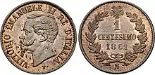With the proclamation of the Kingdom of Italy, the new 1-cent bronze coins, engraved by Giuseppe Ferraris and depicting Victor Emmanuel II, became legal tender on August 1, 1861,[25] and until November 1, 1862, they operated under a dual circulation system.[26] Bronze coins could be exchanged by the state in unlimited quantities, while payments between private individuals were not allowed to exceed the value of 1 lira.[27] The minting of 1-cent coins, in spite of the reported date (1861), did not begin until 1862, and these were struck by the Milan and Naples mints, which minted many with the correct 1862 date. The coins of the Neapolitan mint generally have a worn-out mintage and an impression of the obverse on the reverse; in addition, their weight varies between 1.02 g, for those dated 1861 and 0.99 g for those dated 1862. These slight dissimilarities in weight can also be seen in the later mintages of Umberto I and Victor Emmanuel III.[28] Among those minted in Milan, an extremely rare variant (R4) was found, bearing an upside-down M instead of the usual mintmark.[29] Other 1-cent coins were later minted in 1868 by the Milan and Turin mints, although they bear the date 1867.[29]