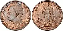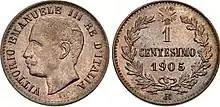 Less than a year after the new king's coronation, a decree was issued regarding the minting of coins with the portrait of Victor Emmanuel III.[34] The style of the 1-cent coin perfectly followed that of his predecessors, and with continuity the same author of his father's coins, Filippo Speranza, was also chosen. This coin was minted annually from 1902 to 1905 and a small amount in 1908 as well,[35] in particular 20000000 of 1-cent coins between 1904 and 1905 were made from the bronze from the demonetized and cast 10-cent coins.[36] The 1-cent coins minted up to 1908 may have a misalignment between the date numerals, less frequently between the cent letters, due to a misalignment of the movable punches in the minting.[37]