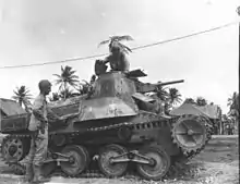 The 1st Tank Division, after being relocated to Japan in 1945, consisted of a division headquarters, two tank regiments (roughly battalion-sized), one motorized infantry regiment, one motorized artillery regiment, one anti-tank battalion, one motor transport battalion, one maintenance battalion, and one engineer battalion.[3]