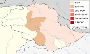 The COVID-19 pandemic in Pakistan was a part of the ongoing pandemic of coronavirus disease 2019 (COVID-19) caused by severe acute respiratory syndrome coronavirus 2 (SARS-CoV-2). The virus was confirmed to have reached Pakistan on 26 February 2020, when two cases were recorded (a student in Karachi who had just returned from Iran and another person in the Islamabad Capital Territory).[3] On 18 March 2020, cases had been registered in all four provinces, the two autonomous territories, and Islamabad Capital Territory,[4] and by 17 June, each district in Pakistan had recorded at least one confirmed case of COVID-19.