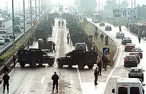 On Monday, 12 November at around 5:20 AM, about 70 armed members of the Special Operations Unit blocked the highway through Belgrade near Sava Centar in the direction of the Gazela Bridge with their Humvee vehicles. Among the rebels was Zvezdan Jovanović, later sentenced to 40 years in prison for the assassination of Đinđić. At around 7:30 AM, Goran Petrović sent his deputy Zoran Mijatović to negotiate with the Unit.[12] Mijatović came to the blockade at around 8 AM, where he talked to Maričić and threatened him with an ICTY indictment. Mijatović was incorrect, seeing as neither Maričić nor any other members of the JSO, apart from Franko Simatović, were ever indicted by the ICTY. During the negotiations on the highway, Mijatović also threatened Maričić saying the population in the surrounding buildings consisted mainly of former and current army officers, many of whom owned weapons. Meanwhile, the Special Anti-Terrorist Unit of the Ministry of the Interior was on full alert that day and the day before.[17][26] The JSO cleared the highway around 3 PM on 12 November.[25]
