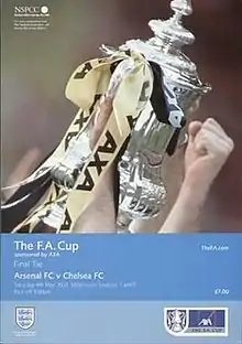 As with last season's event, the final was scheduled before the end of the domestic season. This was partly because the Premier League chose to end its campaign a week later, but with the World Cup starting on 31 May, the FA wanted to give players considerable time to prepare for the finals.[26] This season's staging of the competition offered a greater financial incentive to clubs, given the BBC and Sky Sports signed a joint-deal with the FA, worth £400 million to broadcast matches.[27] Finalists stood to receive £1 million in prize money; the winners would pocket an extra million with additional TV revenues.[27] The BBC spent a million promoting the FA Cup,[28] and as part of their pre-match coverage included a sketch featuring Ricky Gervais.[29] Seat prices for the final exceeded £70, with some ticket touts charging as much as £600 outside the stadium.[30]