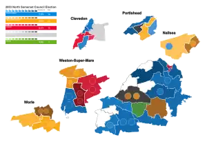 ![]() Map of the results of the 2003 North Somerset council election. Conservatives in blue, independent in grey, Liberal Democrats in yellow, Labour in red and Green Party in green. | |||||||||||||||||||||||||||||||||||||||||||||||||||||||||||||