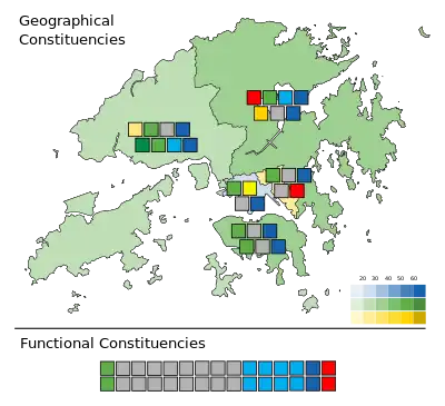 Overall, the democrats took 25 seats and the pro-government camp 35 seats. Bills initiated by the government can still be passed on pro-government support alone, but bills originated by members cannot be passed without democratic support, since these bills require absolute majorities in each sector (geographical and functional) of the legislature.[2] Constitutional amendments require a two-thirds vote and thereby also require support from the democratic camp.