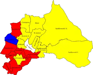 Map of the 2006 Oldham council election. Liberal Democrats in yellow, Labour in red, Conservatives in blue and Independent in grey.