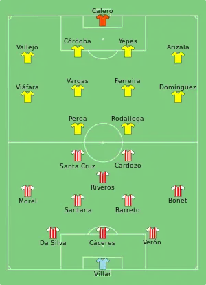 - ↑ Hugo Rodallega played as a goalkeeper after Róbinson Zapata was sent off.