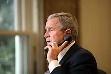 U.S. President George W. Bush speaks with University president John Peters via telephone from the White House to offer his condolences.