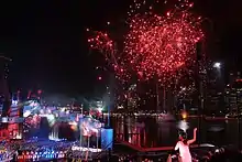 During the "Origins" segment on the city's history, performers entered the stage in freight containers to depict the arrival of the earliest immigrants. The ceremony continued with a dance performance featuring popular songs from the 1940s to the present era. A segment entitled "Monster" told the story of a young boxer who had to fight a giant monster. He summons his Silat warriors to fight against the monster, but they failed, as well as when he summons his Kalari warriors and Wushu warriors. But soon he overcomes his inner fears and defeats the giant monster.[31] Singer Seah Wei Wen then performed "Across The Finish Line" composed by Mayuni Omar & Mathilda D Silva, in the centre of the reflecting pool. It was followed by "Playing with Fire", which featured the dragon as a symbol of courage, strength and wisdom. In this segment, 500 youth from Singapore Soka Association participate to form from many fishes into a dragon.[36] Reflecting the theme of global co-operation, members of the World Youth Orchestra of the Singapore Games performed an orchestral piece featuring various instruments from around the world. The orchestra was led by Darrell Ang, the young associate conductor of the Singapore Symphony Orchestra. The following segment, titled "Bud", depicted rain as a symbol of hope and rejuvenation. Ending the show segment of the ceremony were singers Marcus Lee of Ex-Dee and Lian Kim Selby, performing the song "A New Story", which was commissioned for the event. Their performance was accompanied by a fashion show organized by students from LASALLE College of the Arts.[37]