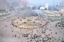 On 1 August, the first day of Ramadan, Egyptian soldiers clashed with protesters in Tahrir Square, tearing down tents the activists had used for the sit-in and where hundreds of protesters had been sleeping in the square since 8 July.[110] Egyptian forces swinging electrified batons and shouting the battle cry "God is great" swiftly chased off dozens of activists who had refused to end four weeks of renewed protests at Tahrir Square to pressure the country's transitional military rulers. Hundreds of riot police backed by armored vehicles and soldiers moved in to tear down the camp of dozens of tents after a group of holdout activists — some of them relatives of people killed in the uprising that toppled Hosni Mubarak in February — refused pleas over loudspeakers to go home. Some in the crowd hurled stones at the police.[111] Protesters' rights groups said that the military police detained 66 people in the process.[112] The removal of the Tahrir sit-in was a calculated political move. Average citizens had been growing weary of the lack of mobility in the central square, so when the military showed up on early Monday afternoon they were met with cheers. Most Egyptians supported the military's actions.[113]