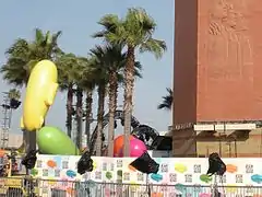 The Orange Carpet and pre-show stage under construction at the corner of Figueroa Street and Jefferson Boulevard, in Los Angeles