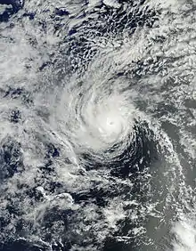 A tropical wave moved off the western coast of Africa on June 18 and continued westward across Central America and into the eastern Pacific by June 29. It subsequently interacted with a large cyclonic gyre, leading to an increase in convective activity and the formation of an area of low pressure. Following satellite and microwave data,[49] the disturbance was upgraded to a tropical depression at 1200 UTC on July 4. Initially, moderate easterly shear prevented much organization as the system tracked west-northwest; however, a reprieve in upper-level winds by 0000 UTC on July 5 allowed the depression to intensify into Tropical Storm Erick as convective bands gained more curvature. A period of steady intensification over the next day allowed the system to attain Category 1 hurricane intensity at 0600 UTC and reach its peak with winds of 80 mph (130 km/h) and a minimum barometric pressure of 983 mbar (983 hPa; 29.0 inHg) six hours later. Decreasing ocean temperatures caused the convective appearance to deteriorate at a steady pace; by 1800 UTC on July 7, Erick weakened to a tropical storm, and by 0600 UTC on July 9, the system no longer sustained enough organization to be considered a tropical cyclone.[50]