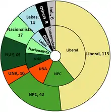 2013 Philippine House district elections chart of votes (inner ring) compared to seats won (outer ring).