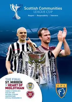 St Mirren finished 8th in the SPL and entered the League Cup in the second round. They too made a fantastic start, thrashing Ayr United. Hamilton were the Buddies' opponents in the third round and Danny Lennon's men sneaked through after a goal in stoppage time. The quarter-finals saw the Saints take a trip up to Pittodrie to face Aberdeen, and after a 2–2 draw after extra time, the men from Paisley won on penalties. A trip to Hampden Park for the semi-finals saw St Mirren run out 3–2 winners against Celtic and set up a final against Hearts. St Mirren won the final 3-2 against Hearts.[1][2][3] It was their first major trophy since the 1987 Scottish Cup victory.[4][5]