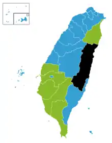 | Taitung County | 179,015 | 67.82 | Justin Huang | 64,272 | 54.41 | Liu Chao-hao | 53,860 | 45.59 | ![]() | ||