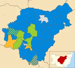 28 Conservative councillors became the governing group of the council (compared to 20-member minority administration with an opposition of 20 before the election) leaving 12 councillors in opposing groups. Conservatives and Greens made gains. Independents and Lib Dems sustained a net loss of five seats combined. Labour and Suffolk Together councillors lost their total of three seats. Two councillors (a Green and a Conservative) were re-elected by default as the only candidates nominated in the rural Haughley & Wetherden and Worlingworth wards respectively.