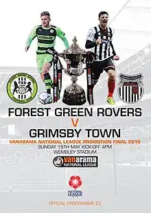 The 2016 National League play-off final, known as the 2016 Vanarama National League Promotion Final for sponsorship purposes, was an association football match between Forest Green Rovers and Grimsby Town on 15 May 2016 at Wembley Stadium in London. It was the 14th National League play-off final, the first under the name National League and the ninth to be played at Wembley. Grimsby won the match 3–1 to earn promotion into League Two, returning into the Football League after a six-year absence.[1]
