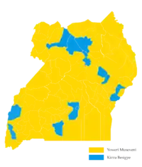 ![]() Presidential election results map. Yellow denotes provinces won by Museveni, and Blue denotes those won by Besigye. | |||||||||||||||||