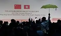 In 2004, the National People's Congress Standing Committee (NPCSC) had ruled out universal suffrage in the 2012 Chief Executive election, but in 2007 ruled that the 2017 Chief Executive election "may be implemented by the method of universal suffrage".[3] On 31 August 2014, however, the NPCSC imposed the nebulous condition that "the Chief Executive shall be a person who loves the country and loves Hong Kong" and that the process of selection of two or three candidates by an undemocratic nominating committee continue.[4] The pan-democrats viewed the restrictive nominating process as a violation of international standards for free elections, as candidates unsupportive of the central government would likely be screened out. The "831 decision", as it was called, triggered a class boycott in Hong Kong which escalated into an unprecedented 79-day large-scale occupy movement, internationally known as the "Umbrella Revolution".[5][6]