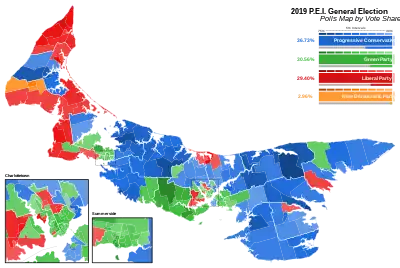 ![]() Popular vote by district. As this is a FPTP election, seat totals are not determined by popular vote, but instead by the result in each district. District names are listed at the bottom. The results of the deferred Charlottetown-Hillsborough Park election are included in a separate inset. | |||||||||||||||||||||||||||||||||||||||||||||||||