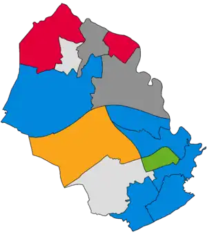 ![]() A map presenting the results of the election, by party of the councillor elected from each ward. | ||||||||||||||||||||||||||||||||||||||||||||||||||||||||||||||||||||||||||||||||||||||||||||||||