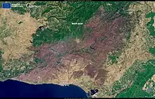 A major fire started near the city of Alexandroupolis in eastern Western Thrace on August 21. The fire was stated to be "the largest recorded in the EU" up to this time by EU officials, with around 73.000 hectares (730 square kilometers) burnt.[22][23] Most of the burnt area is concentrated in the Dadia Forest. Several migrants died when they got trapped by the flames near the Dadia Forest. As of the 28th of August the vast majority of the Dadia forest as well as the surrounding pine forests have been destroyed with more than 80,000 hectares (198,000 acres) scorched.[24] On the island of Samothraki a power outage occurred because of the Alexandroupolis fire. The general hospital of Alexandroupolis had to evacuate its patients. The fire had almost reached the hospital.