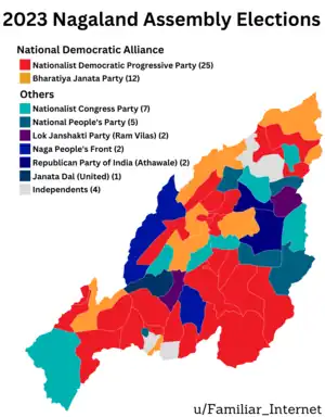 - 1 2 "In Nagaland, BJP settles for 20:40 seat-sharing with NDPP, ignores protests". The Indian Express. 2 February 2023. Retrieved 15 February 2023.