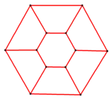 | A hexagonal prism, projected into the plane by perspective, centered on a hexagonal face, looks like a double hexagon connected by (distorted) squares. Similarly a 6-6 duoprism projected into 3D approximates a torus, hexagonal both in plan and in section. | |