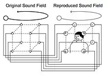 This method involves strategically placing eight speakers to simulate spatial sound, instead of attaching sampled sound to objects. [6] The first step consists of capturing the sound by using a cubic microphone array in the original sound field. The sound is then captured using the cubic loudspeaker array in the reproduced sound field. The listener, who is in the loudspeaker array, will feel that the sound is moving above their head when the sound is moving above the microphone array. [6]