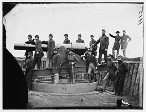 In the spring of 1864, the 3rd Unattached Company, along with the 6th through 12th, were ordered to Washington, DC, where they were to garrison the forts protecting the capital. In June 1864, the 6th, 7th, 8th, 9th, 10th, 11th, 12th, and 14th independent companies were part of the 3rd brigade, within Joseph A. Haskin's division.[2] At the same time, the 3rd and 15th companies were part of the 2nd brigade within Gustavus De Russy's division.[3]