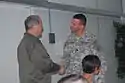 Congressman Steve Israel greets Brian S. Caskey (3-142 Aviation) during Israel's 2008 visit to Iraq.