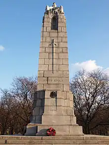 The memorial was designed by two architects, Eric Haldenby and Alvan Mathers and features a 12 metres (39 ft) high white granite shaft, with four niches at its top and an open dome as its capstone.[3] The north side of the monument features an inscription that reads "swords of sacrifice" on the monument's bas-relief, with a list of engagements that the regiment was involved in during the Second Boer War listed below the inscription.[3] Regimental battle honours from the First World War are also listed on the monument's east and west face; whereas the unit's battle honours from the Second World War are inscribed on the monument's south face.[3]