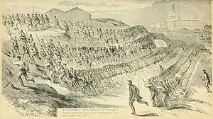 ![]() The 5th Massachusetts charges up a hill in Washington D.C. during training, May 1861. The U.S. Capitol is shown in the background. | |
