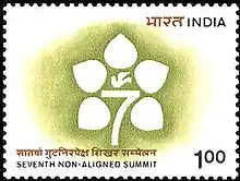 Seventh Summit Conference of Heads of State or Government of the Non-Aligned Movement on 7–12 March 1983 took place in New Delhi in India, one of the founders and leading members of the Non-Aligned Movement.[1] The summit followed the 1979 summit in Havana, Cuba at which confrontation between moderate member states led by SFR Yugoslavia and India and radical states led by Cuba led the movement into crisis.[2] The keynote address delivered by Prime Minister of India Indira Gandhi.[1] At the summit in New Delhi Bahamas, Barbados, Colombia and Vanuatu were admitted as new member states, Papua New Guinea, Antigua and Barbuda as observers and Dominican Republic as an guest state.[2] Cambodia was absent from the meeting due to rival delegations controversy, Saint Lucia failed to send a delegation while Luxembourg's request for an guest status was rejected on formalistic deadline grounds.[3] 1,500 journalists followed the event.[3]