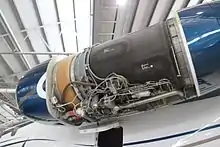 The AE 3007 is a direct drive turbofan engine with a single stage fan, a 14-stage axial compressor with 6 stages of variable vanes including inlet guide vanes, an annular combustor, a two-stage high pressure turbine and a 3-stage low pressure turbine. The accessory gearbox is mounted at its bottom and two single channel FADEC units are mounted in the aircraft. It has fore and aft mounting provisions for underwing pylon or aft fuselage installation.[10] The AE 3007 has a thrust-specific fuel consumption (TSFC) of 0.36 lb/(lbf⋅h) (10 g/(kN⋅s)) at static sea level takeoff and 0.65 lb/(lbf⋅h) (18 g/(kN⋅s)) at a cruise speed of Mach 0.8 and altitude of 35,010 ft (10,670 m).[11] The engine's A variant was designed to produce a cruise thrust of 6.3 kN (640 kgf; 1,420 lbf) at Mach 0.8 and 41,000 ft (12,000 m) altitude.[12]