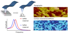 The AFM-IR technique can simultaneously provide complementary measurements of the mechanical stiffness and dissipation of a sample surface. When infrared light is absorbed by the sample the resulting rapid thermal expansion excites a "contact resonance" of the AFM cantilever, i.e. a coupled resonance resulting from the properties of both the cantilever and the stiffness and damping of the sample surface. Specifically, the resonance frequency shifts to higher frequencies for stiffer materials and to lower frequencies for softer material. Additionally, the resonance becomes broader for materials with larger dissipation. These contact resonances have been studied extensively by the AFM community (see, for example, atomic force acoustic microscopy). Traditional contact resonance AFM requires an external actuator to excite the cantilever contact resonances. In AFM-IR these contact resonances are automatically excited every time an infrared pulse is absorbed by the sample. So the AFM-IR technique can measure the infrared absorption by the amplitude of the cantilever oscillation response and the mechanical properties of the sample via the contact resonance frequency and quality factor.[53]