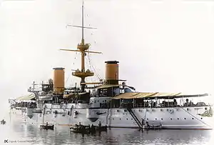 The ship's waterline armor belt had a maximum thickness of 5.9 inches (150 mm) amidships and tapered to 3.1 inches (79 mm) towards the ends of the ship. Between the main gun barbettes it covered the entire side of the ship up to the level of the upper deck. The barbettes, the conning tower, and gun turrets were also protected by 5.9-inch armor.[1] Her deck armor ranged from 1 to 2 inches (25 to 51 mm) thick.[2]