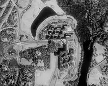 In 1969, AT&T began plans to construct an administration corporate complex in the suburbs. In early 1970, AT&T began purchases of land in the suburbs of New Jersey for this office complex and began construction in 1974. The award-winning architect, Vincent Kling, designed a Fordism[35] style, luxurious "Pagoda"[36] campus layout and the construction firms: New York based Walter Kidde and Newark, New Jersey based Frank Briscoe, managed this joint venture construction project with Vollers Construction of Branchburg, New Jersey, as the subcontractor. The 295 North Maple Avenue and Interstate 287 location of Basking Ridge in Bernards Township, New Jersey was completed in 1975 for the AT&T General Department offices. Employees began moving, in November 1975, to the seven inter-connected building complex using 28 acre of the property. The property had a 15-acre underground parking garage with spaces for 3,900 vehicles, and included a Class 1 licensed private helipad, a two-story cafeteria, a wood-burning fireplace, an indoor waterfall at the entrance lobby, and a seven-acre created lake for flood control. The entire property was 130 acre and cost $219 million to construct. Later, across the street from the complex, AT&T purchased additional land and established its' Learning Center in 1985, at 300 North Maple Avenue, to become a 171 conference room inn. The AT&T Learning Center won the commercial property known as Somerset County's Land Development Award that year. In 1992, Basking Ridge location would become a corporate headquarters just before AT&T leased the New York City, 550 Madison Avenue building to Sony in 1993. The corporate statue, known as "Golden Boy" was moved in 1992, from the former New York City headquarters to this current New Jersey headquarters.[37] In 1992, a corporate art consultant approached, artist sculptor, Elyn Zimmerman, to commission a 30-foot diameter project with fountain and seating area for the conference center courtyard gardens. In 1994, the project was completed and had one 34 ton granite boulder centered on top of the other boulders, which flowed water from the fountain designed by fountain engineer, Dr. Gerald Palevsky.[38] AT&T occupancy at the location peaked to 6,000 employees in its' heyday before AT&T experienced competition and downsizing.