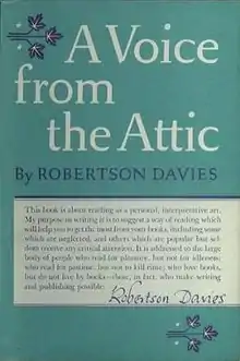 A Voice from the Attic is a collection of Robertson Davies' essays about reading aimed at intelligent and thoughtful readers, whom he calls the "clerisy". The title is a quote from Patrick Anderson and has a particular contemporary resonance in Davies' native Canada.[1] Shannon King described this as a deprecatory phrase indicating "a quaint rummage bin of colonial past".[2]