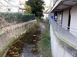 The Aal is a small river in the town of Aalen in Baden-Württemberg, Germany. It originates in the Dürrwiesen near the road bridge of the K 3326 at the western end of the street Gartenstraße through the confluence of the left Rombach and the right Sauerbach, that slightly exceeds the Rombach in length and area of basin. From here, the Aal first flows in an eastern and later northeastern direction. After 1.6 km, it flows on the left side of the Reichstädter Markt into the Kocher.